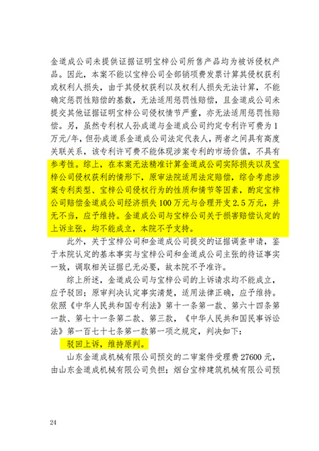關(guān)于煙臺(tái)寶梓建筑機(jī)械有限公司侵犯山東金道成機(jī)械有限公司專利權(quán)的判決
